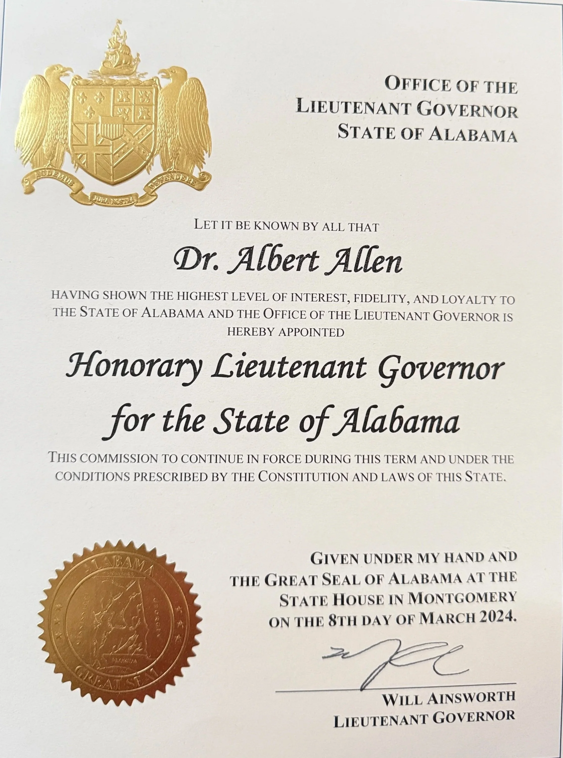 Honorary Lieutenant Governor for the State of Alabama 2024