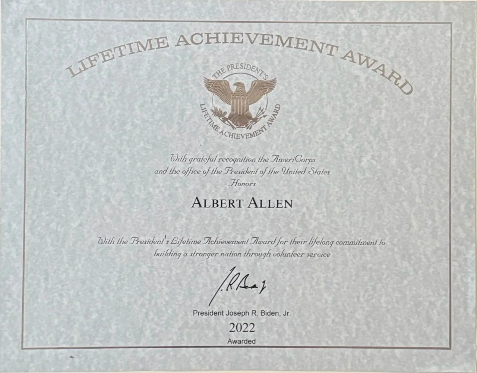 In 2022, Albert Allen was formally recognized by President Joe Biden for his lifelong dedication to building a stronger nation through voluntary service. This prestigious award serves as a testament to his enduring commitment to civic duty and his profound impact on communities both at home and abroad.